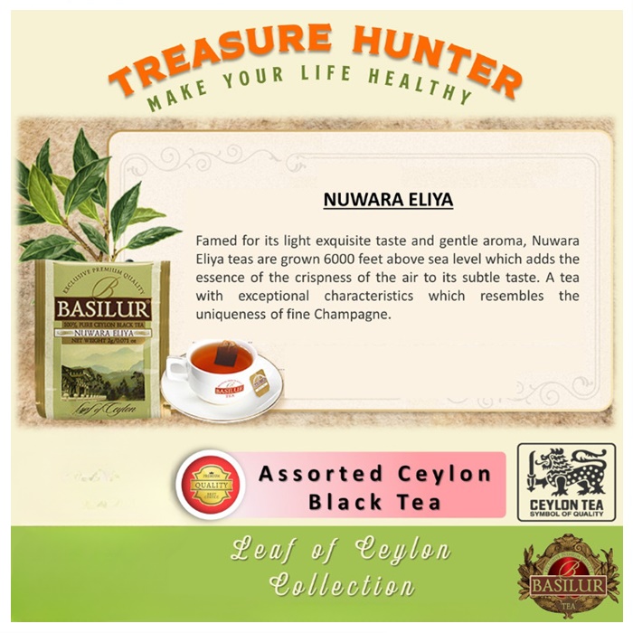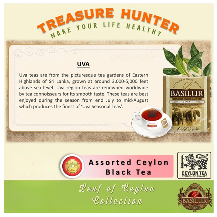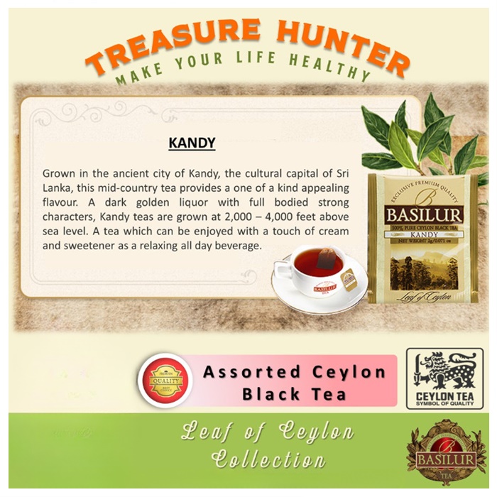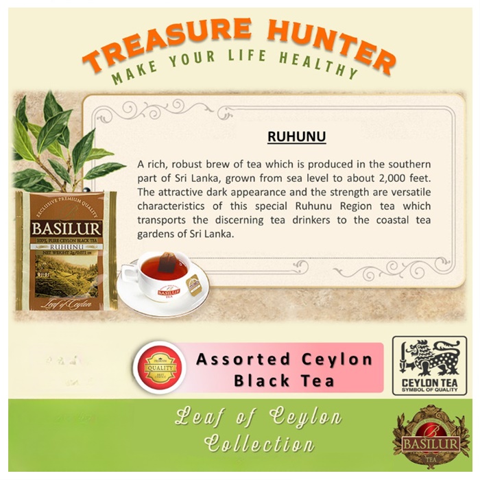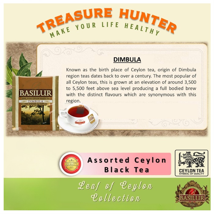 -Dengan memilih jenama Basilur yang diiktiraf di peringkat global, anda boleh yakin bahawa anda sedang mendapatkan teh Ceylon sebenar, yang keasliannya disahkan oleh sijil Simbol Kualiti Teh Ceylon.