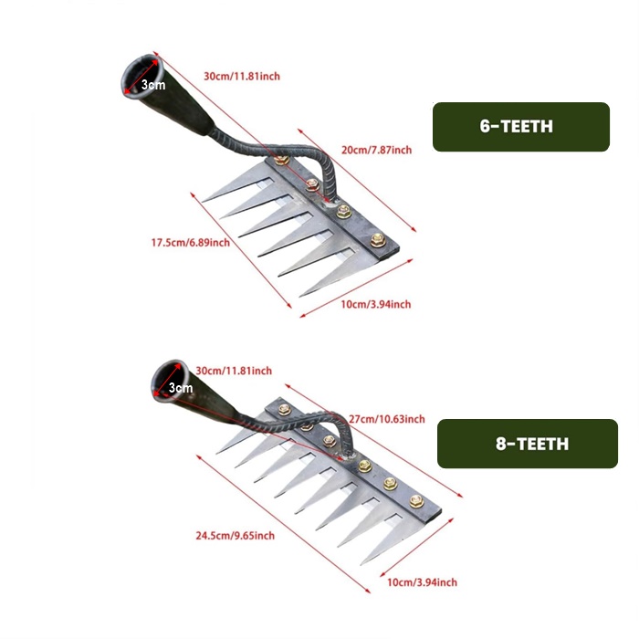 ✅ Multi-Purpose Gardening Tool – Equipped with 6/8 sharp teeth, this rake efficiently removes weeds, loosens compacted soil, clears leaves, and dethatches grass. A versatile tool suitable for vegetable gardens, flower beds, and lawns.
