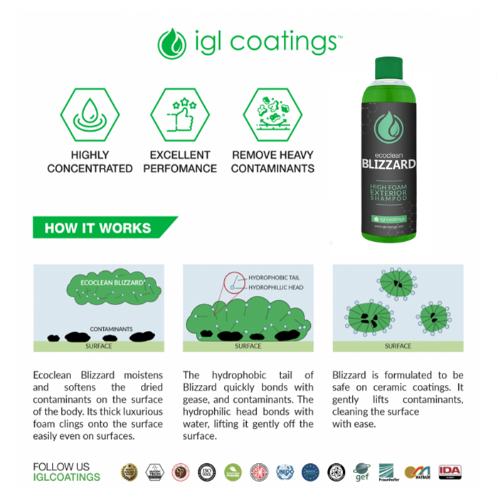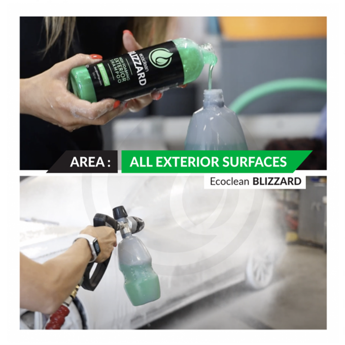 Ecoclean Blizzard ialah formula berbuih kaya ultra mewah dan direka khusus dan selamat digunakan pada salutan. Mengutamakan bahan mentah yang diperoleh secara mampan, formula pekatnya membolehkan penggunaan produk yang kurang untuk liputan yang lebih luas. Buih Blizzard yang kaya, tebal, mewah dan tahan lama melekat pada kotoran dengan berkesan dan melarutkan kekotoran dengan menariknya perlahan-lahan dari permukaan untuk dicuci dengan mudah. Ia mengangkat kotoran dan melarutkan kekotoran dengan melekat pada permukaan dengan lembut. Menggunakan bahan mentah yang mampan, formula pekat membolehkan penggunaan yang lebih rendah dan liputan yang lebih tinggi, menjimatkan masa dan kos. Boleh digunakan sebagai pre-wash.