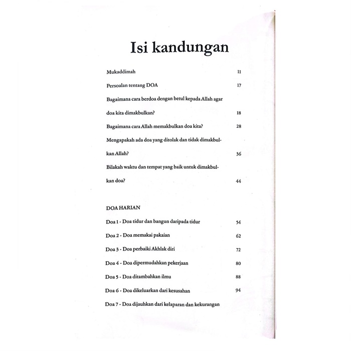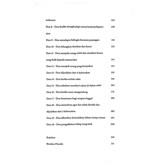 This writing provides a more detailed explanation and touches on our current situation as Muslims who are living a challenging life at the moment. The prayers this time are collected according to the selection of prayer topics that are very related to daily life, for example, prayers for depression/anxiety, prayers for improving morals, prayers for making work easier, prayers for eliminating grudges and hatred, prayers when very sick, prayers for becoming a righteous person and many more.