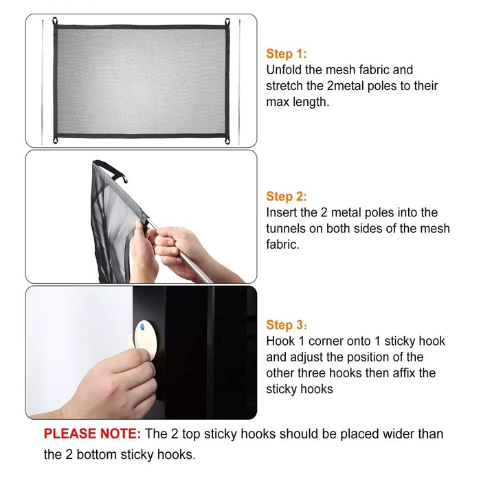 - Each group contains a woven mesh, two telescopic rods and four sticky hooks.