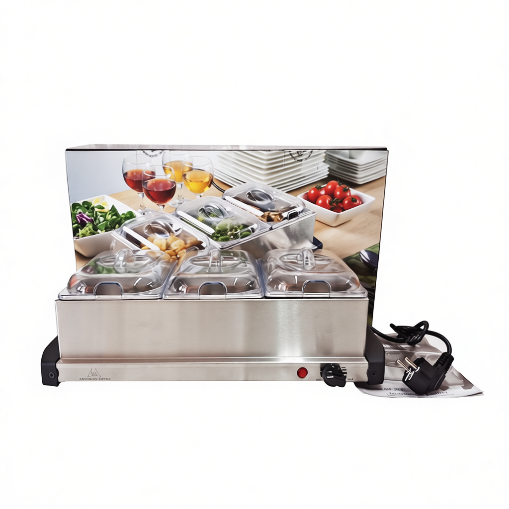 Jika anda cuba membuat bufet pelayan bufet yang lebih hangat ini sangat sesuai untuk cabaran. Ia boleh digunakan dengan sendirinya kerana dulang pemanasan akan memastikan makanan hangat sehingga 3 jam. Takik sudu bersepadu di dalam penutup memastikan sudu hidangan berehat dengan selesa dengan penutup di tempatnya. Laraskan suhu kepada suhu yang anda suka sediakan bufet anda dan jangan risau makanan anda menjadi sejuk lagi.