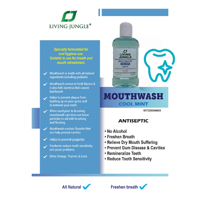 All Natural Freshen breath Mouthwash dibuat dengan semua bahan semulajadi termasuk probiotik Freshener mengurangkan sensitiviti gigi, masalah yis mulut. Oren Pahit, Thymol, & Lime Mouthwash datang dalam perisa segar & ia juga membunuh bakteria yang menyebabkan nafas berbau. Membantu mengelakkan plak daripada terkumpul pada gusi anda dan di antara gigi anda. Apabila digunakan sebelum memberus kumur boleh membilas zarah kita yang longgar untuk membantu dengan memberus dan membilas. Cuci mulut mengandungi fluorida yang boleh membantu mencegah kaviti. Membantu mencegah gingivitis.