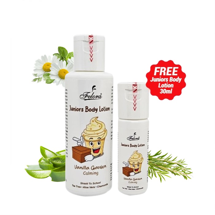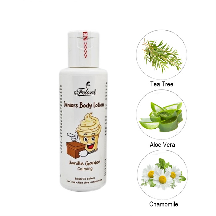 Our junior body lotion is specially crafted with a blend of natural ingredients to provide gentle care for children's delicate skin. Infused with tea tree oil, known for its antibacterial and anti-inflammatory properties, the lotion helps cleanse and soothe the skin, making it ideal for sensitive or acne-prone skin. Aloe vera adds deep hydration without greasiness, while chamomile calms and reduces inflammation, promoting relaxation. The lotion's vanilla fragrance offers a delightful scent, and its 'shield to school' feature helps protect the skin from environmental stressors, making it perfect for daily use. Overall, our lotion nourishes, protects, and soothes, ensuring that children's skin stays healthy and happy.