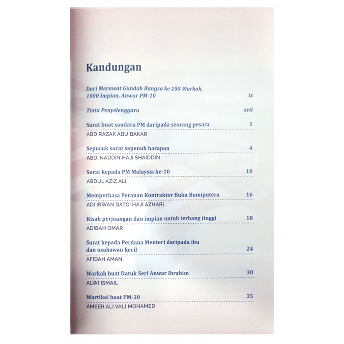 100 Warkah, 1000 Impian, Anwar PM-10 - is a collection of 100 letters including the voice of the heart, views, dreams, devotion and hope to one Anwar, the Prime Minister of Malaysia.
