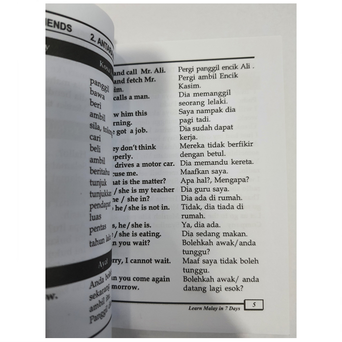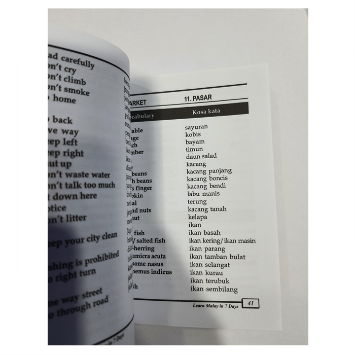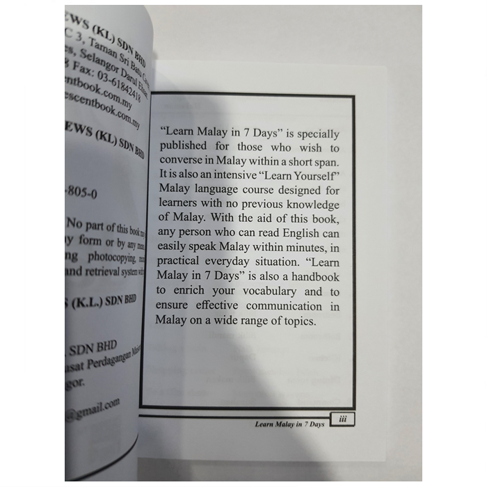 Learn Malay in 7 days is specially published for those who wish to converse in Malay within a short span. It is also an intensive Learn Yourself Malay Language course designed for learners with no previous knowledge of Malay. With the aid of this book, any person who can read English can easily speak Malay within minutes in practical everyday situations. Learn Malay in 7 days is also a handbook to enrich your vocabulary and to ensure effective communication in Malay in a wide range of topics.