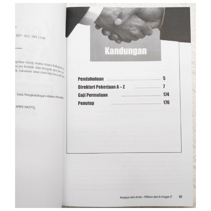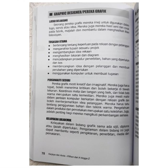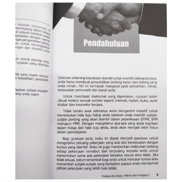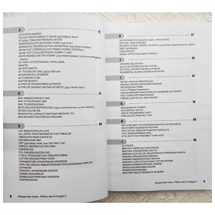To get the necessary information, references can be made through many sources such as the Internet, brochures, books, newspapers and career counselors. It is not too early if you take the initiative to determine the direction of your life before you choose the important subjects that will be taken in the STPM, SPM or PMR exams. By knowing what you want in life and your direction, you will be more focused in your studies. For graduates, this book can be a guide to find out the job opportunities that are available and are compatible with the courses taken.