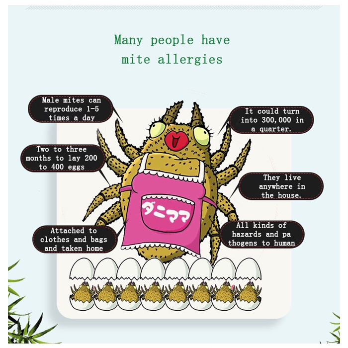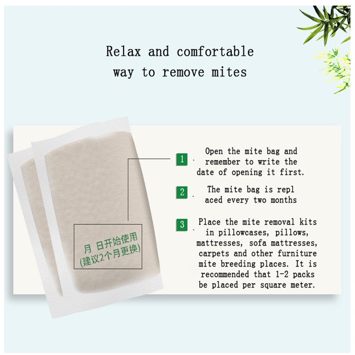 3. The mite removal package should be replaced every two months; If pillowcase is used, it is recommended that each pillowcase should be placed in a bag of bedroom (bedspread/mattress interlayer) between the mattress and the mattress, which is located at the four corners of the bed to ensure the range of mite removal