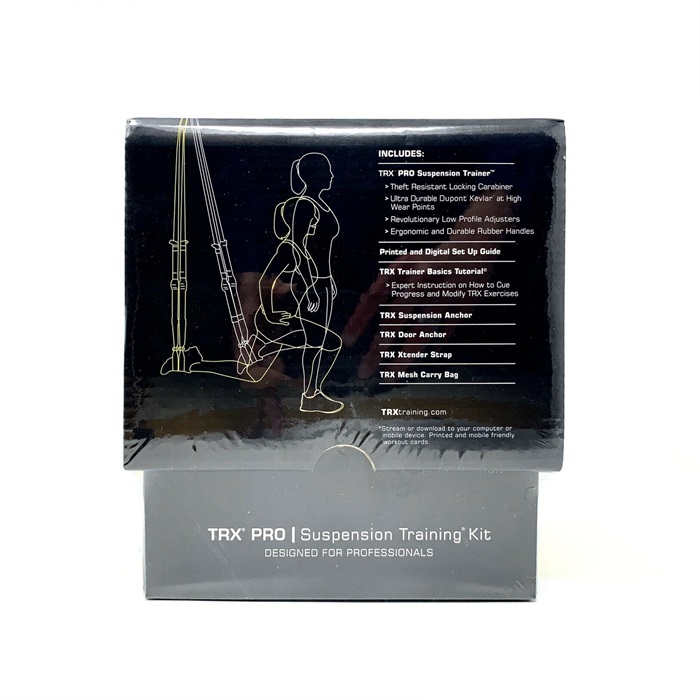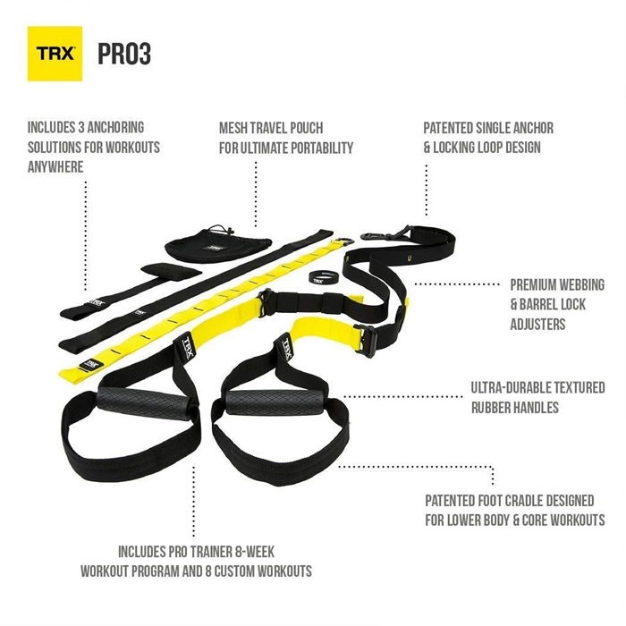 Train the entire body by combining variable-resistance bodyweight training, elements of instability and multiple planes of movement Weighs less than 2 lbs., requires minimal storage space and can easily set up anywhere Supports users up to 300 lbs. The new TRX PRO Suspension Training Kit contains our strongest, most secure Suspension Trainer with durable, easy to clean rubber handles, a locking carabiner to deter theft and three different types of anchors for maximum versatility.