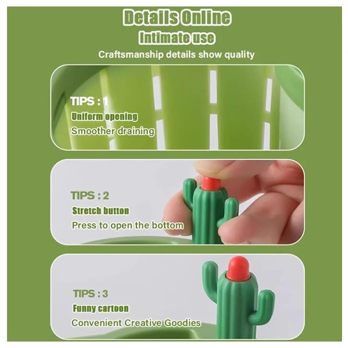 -Reka Bentuk Kaktus Unik: Tambahkan sentuhan suka bermain pada dapur anda dengan reka bentuk kaktus yang comel. Kepala tekan pada kaktus membolehkan penapisan mudah sisa dengan hanya satu tolakan.
