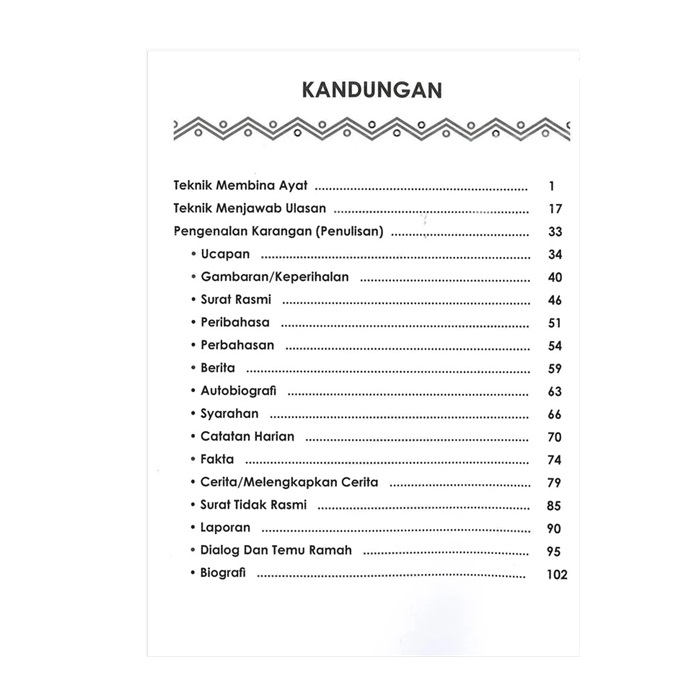 Buku ini dicipta khas untuk pelajar sekolah rendah yang lemah dalam subjek Bahasa Malaysia. Pelajar yang lemah dapat meningkatkan penguasaan bahasa mereka dengan menggunakan karangan contoh yang disediakan di dalam buku ini. Ilustrasi menarik dapat menarik perhatian pelajar dan menolong proses pembelajaran. Buku ini sesuai untuk pelajar sekolah rendah Tahap 1 dan 2 yang akan menduduki peperiksaan UPSR.
