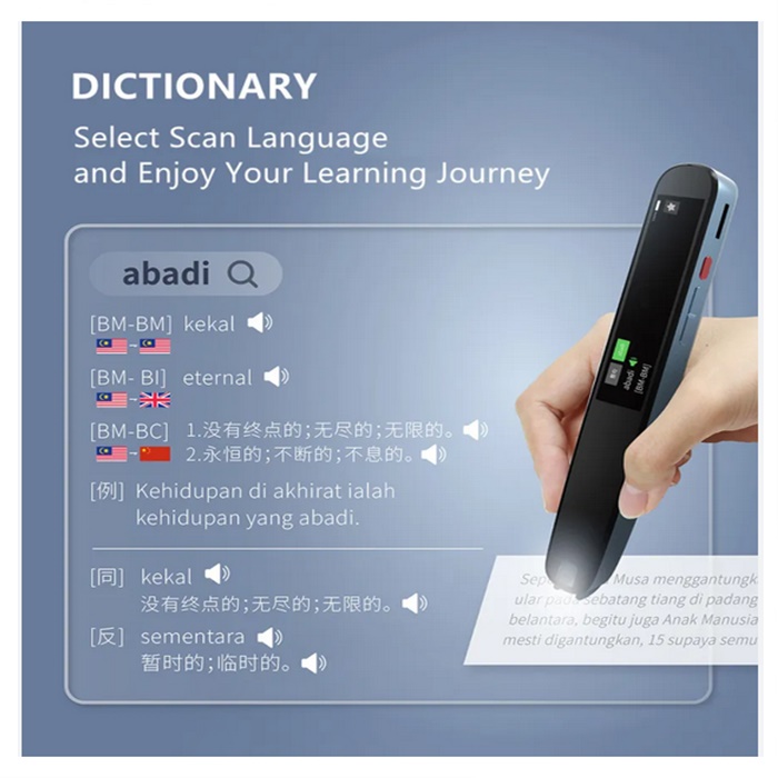 使用 Spirgo 3A Plus 智能翻译词典笔,释放多语言交流的力量。这款先进的工具为马来语、中文和英语提供全面的语言支持和离线使用,非常适合学生、专业人士和旅行者。
