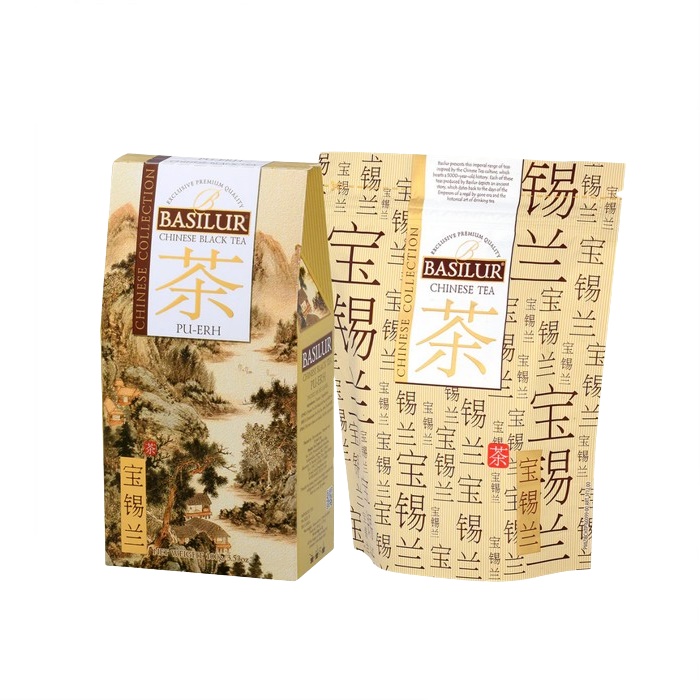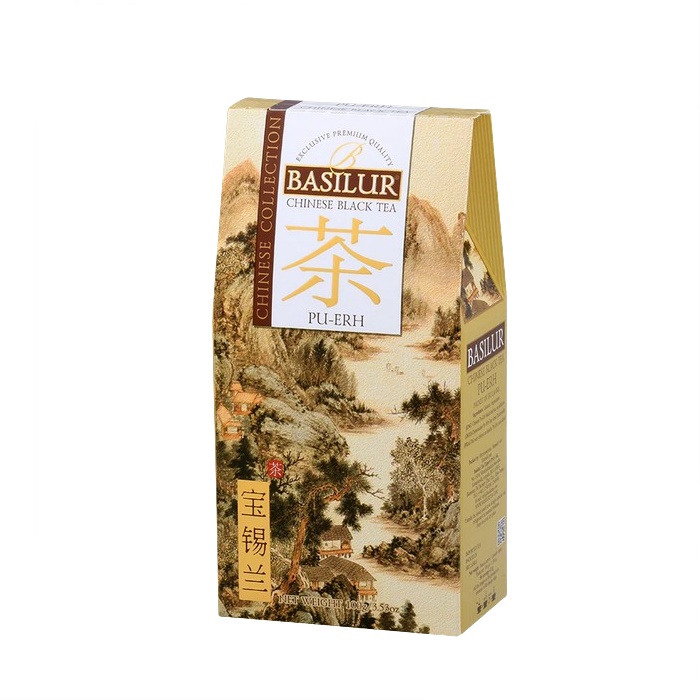 Teh Hitam Cina BASILUR - Teh Pu Erh ialah teh merah Cina yang terkenal dengan ciri rasa dan aromanya yang sedikit "tanah" dan berasap. Juga dikenali sebagai "pembakar lemak", ia menonjol untuk kaedah pemprosesan yang unik, yang melibatkan pengeringan daun teh hijau segar termasuk, diikuti dengan penapaian dalam keadaan hangat, lembap selama 3-6 minggu. Selepas penapaian lengkap, daun dikeringkan semula, memberikan warna merah pada tepi dan hujung. Teh itu matang di dalam gua yang gelap dan dari masa ke masa memperoleh sifat uniknya. Sesuai untuk gourmet yang mencari rasa yang mendalam dan berbeza.