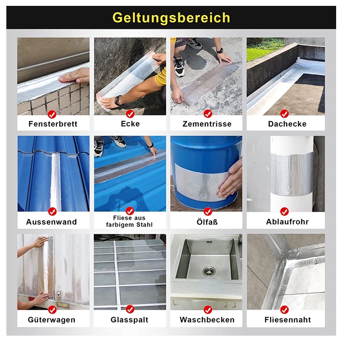 适用范围:这种密封胶带广泛用于建筑屋面,表面开裂,房车维修,窗户,船舶密封,玻璃和屋顶维修,水管分别漏水,也是很好的露营用品,可以帮助您密封露营者的裂缝。
