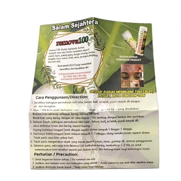 REMOVA100 ialah krim tradisional berasaskan herba semulajadi yang berkesan untuk membuang tahi lalat, ketuat dan kutil secara selamat dan tanpa pembedahan. Dirumus khas dengan campuran botani dan rempah ratus terpilih dari alam semulajadi Nusantara seperti: