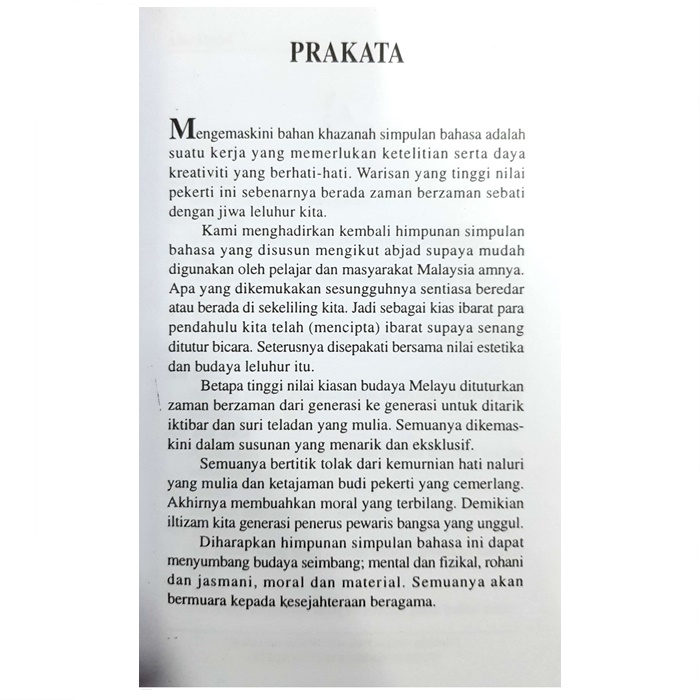 - Semuanya bertitik tolak dari kemurnian hati naluri yang mulia dan ketajaman budi pekerti yang terbilang. Demikian iltzam kita generasi penerus pewaris bangsa yang unggul. Diharapkan himpunan simpulan bahasa ini dapat menyumbang budaya seimbang, mental dan fizikal, rohani dan jasmani, moral dan material. Semuanya akan bermura kepada kesejahteraan beragama.