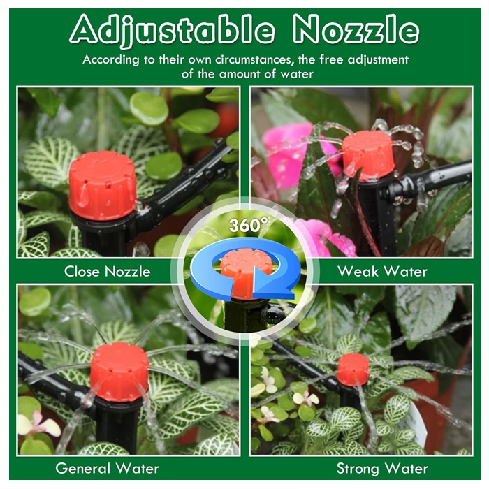 3.Adjustable Drippers: Twist the adjustable dripper's red cap to choose between sprinkler, drip-like, or closed shapes to meet different watering needs.