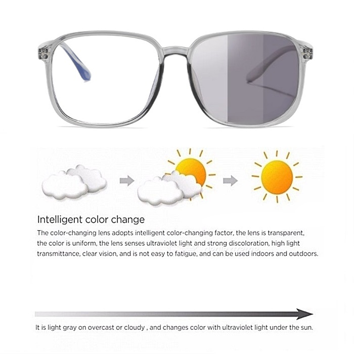 - HOTOCHROMIC LENS; the lens will change color automatically when exposed to sunlight.