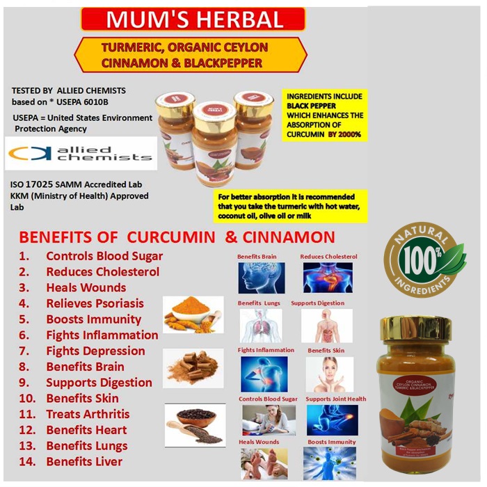 Bahan - Kunyit, Ceylon Cinnamon, Black Pepper (Bahan termasuk BLACK PEPPER yang meningkatkan penyerapan kurkumin sebanyak 2000%)