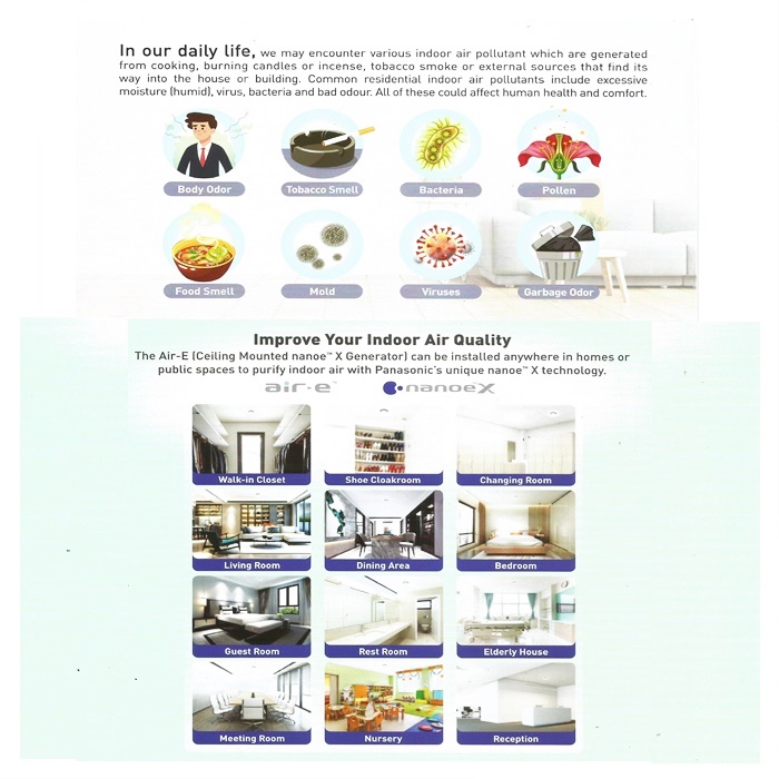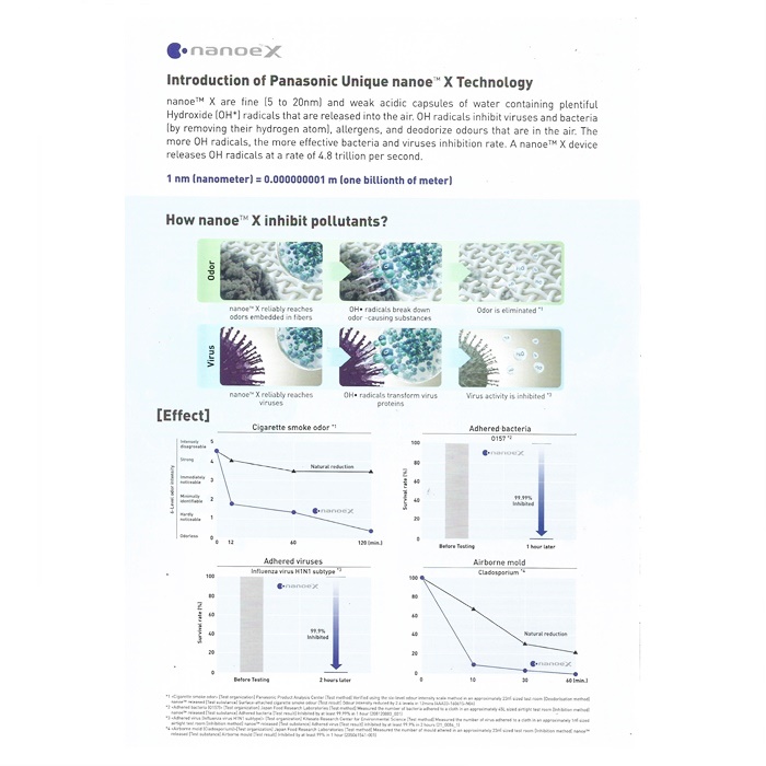 Nanoe™ ialah zarah air halus (5 hingga 20nm) yang mengandungi banyak radikal hidroksil. Peranti nanoe™ mengeluarkan zarah air ini untuk menghalang virus, bakteria, bau dan alergen dengan berkesan. Teknologi nanoe™ X boleh membawa faedah luar biasa ini di dalam rumah supaya permukaan keras, perabot lembut dan persekitaran dalaman boleh menjadi tempat yang lebih bersih dan menyenangkan.