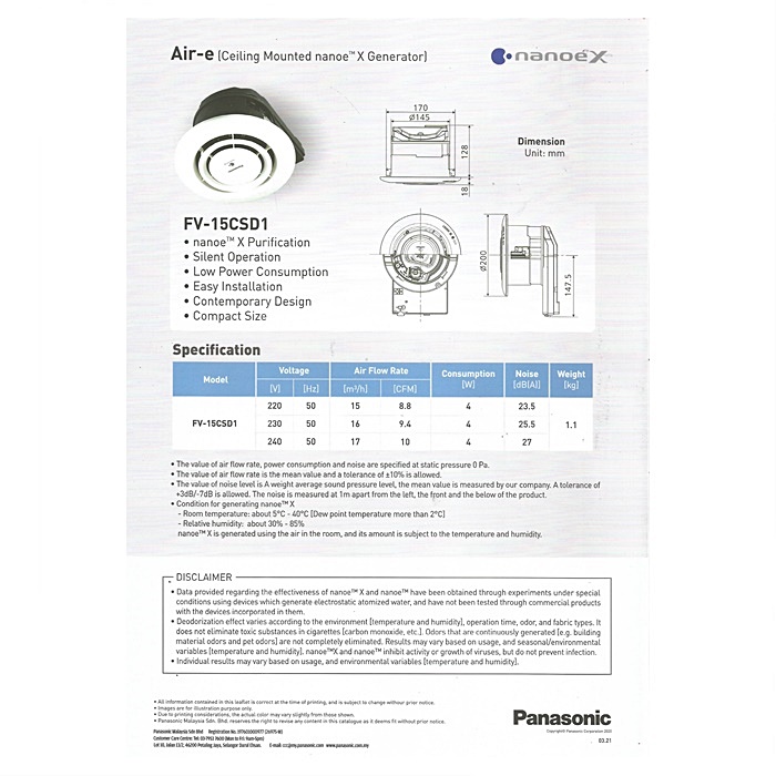 nanoe™X Air-e Ceiling Mount nanoe™X Generator FV-15CSD1 menghalang 99.9% virus (H1N1 dan H5N1) dalam 2 jam dan 99.9% bakteria (E.Coli 0157, MRSA) dalam 1 jam