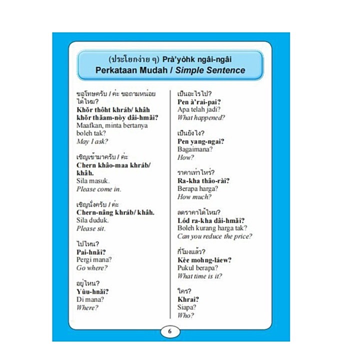 Buku ini diterbitkan untuk dijadikan rujukan kepada semua golongan yang ingin mempelajari bahasa Thai. Penggunaan perkataan, frasa dan ayat yang mudah dapat membantu pembaca mempraktikkan penggunaan bahasa Thai dalam perbualan harian mereka.