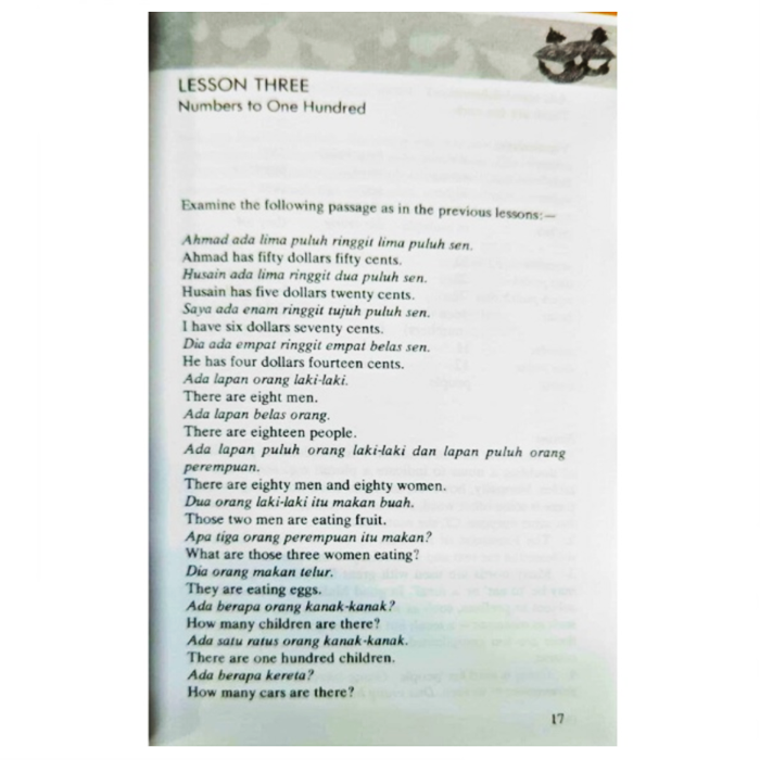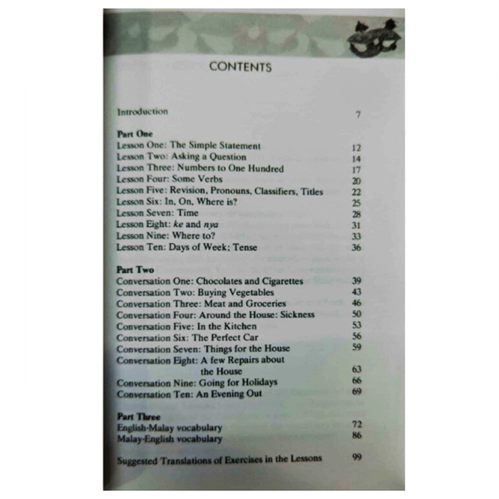 This book enables you to communicate in practical everyday situatuons-in the market, running a household, entertaining friends or travelling. In a Series of easy lessons, each consisting of a reading passage a list of importan words, notes on grammatical usage and a translation exercise you teach yourself how to speak and write Malay efficiently. When you have mastered the contents of this book, you should find no difficulty in making yourself understood, nor in understanding what people say to you in the Malay language.