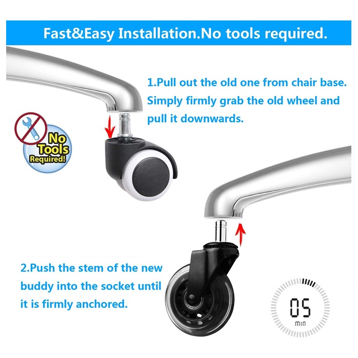 1.These Polyurethane replacement office chair wheels will relieve the stress of rolling on your office chair. Never get frustrated again. Let smooth gliding be the new normal! Just glide from lower to higher surface with ease. Roll from hardwood floor to carpet with ease.