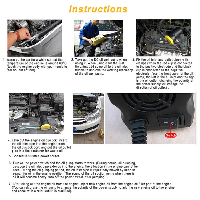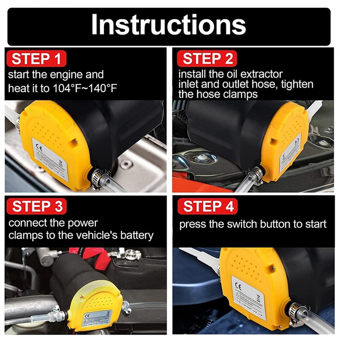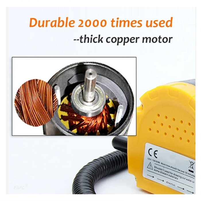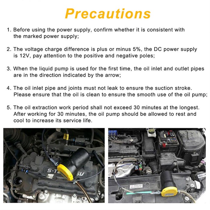 Compatibility: Not suitable for extracting water (due to no lubrication of the pump), gearbox oil (too viscous), or easily flammable liquids like fuel or petrol. Ideal for cars, motorcycles, and other 12V vehicles.
