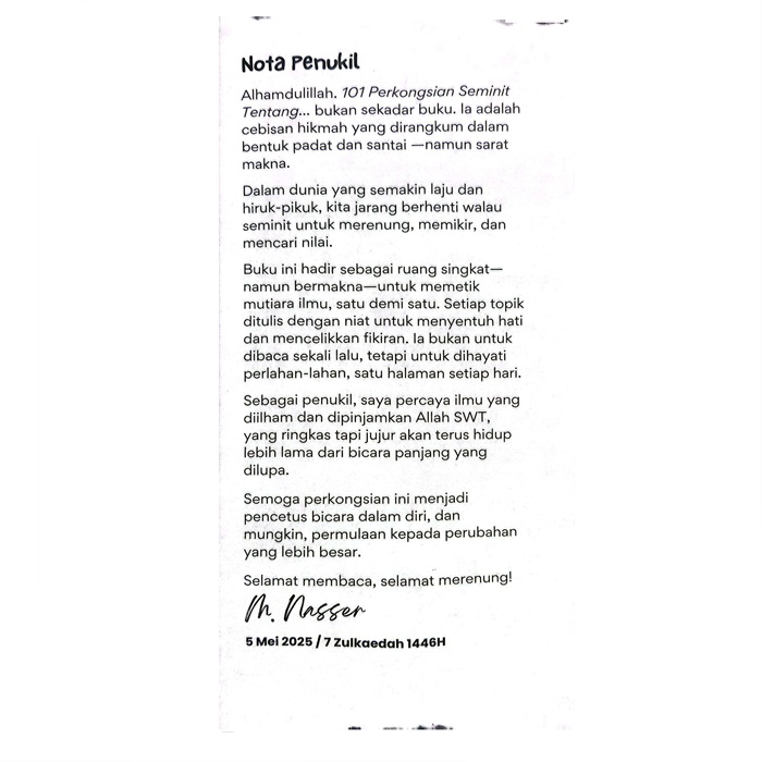 Buku 101 Perkongsian Seminit Tentang... menghimpunkan catatan ringkas yang menyentuh hati — sesuai untuk dibaca ketika jiwa sedang lesu atau hati mencari arah. Tulisan yang jujur dan lembut, menyentuh topik seperti: