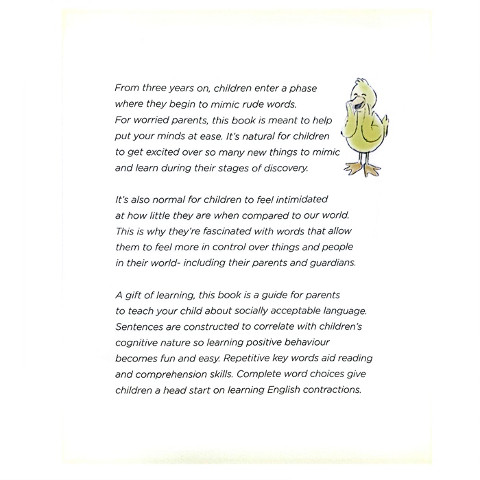 In this delightful tale, children learn the value of using polite and socially acceptable language. The story gently guides young readers and listeners to recognize and move away from negative behaviors like mimicking or using rude words, while promoting kindness and respectful communication.