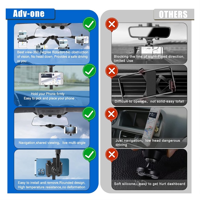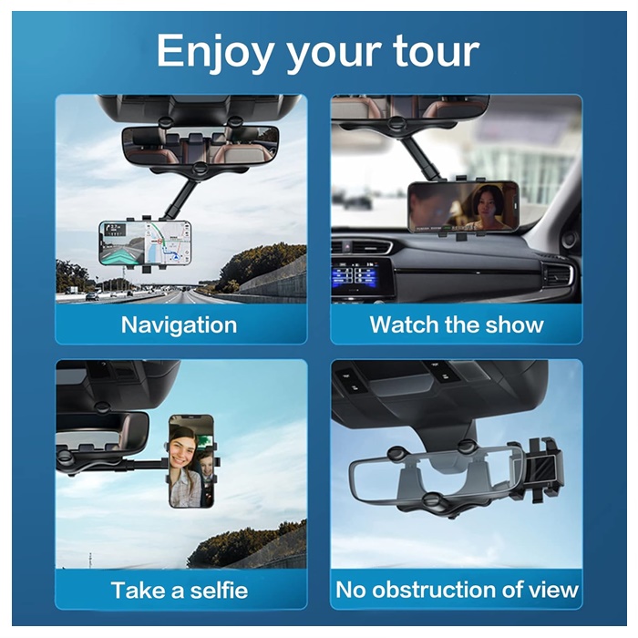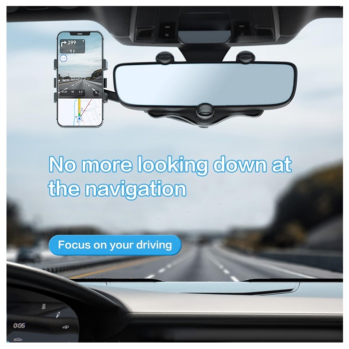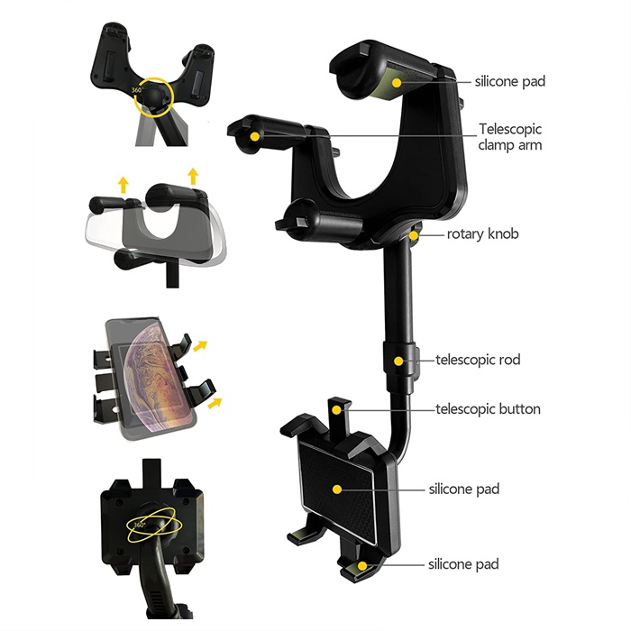 * Equipped with an automatic adjustment clamp arm, the holder is easy to install. Simply attach the telescopic clamp arm to the rearview mirror above the driver’s seat for a secure fit that stays in place, even on bumpy roads.