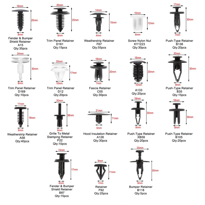 Need not worry about lost or damaged body fasteners.All the necessary retainers for exact replacement of old and broken retainers.