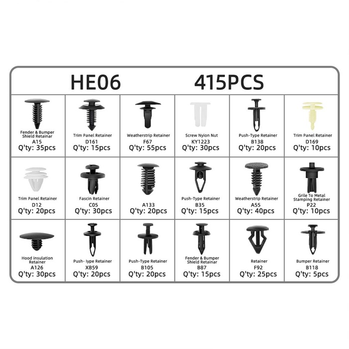 Petak kotak dengan penyenaraian terperinci saiz & kuantiti.6 jenis klip.Sangat sesuai untuk Toyota ,Honda, GM, Ford.