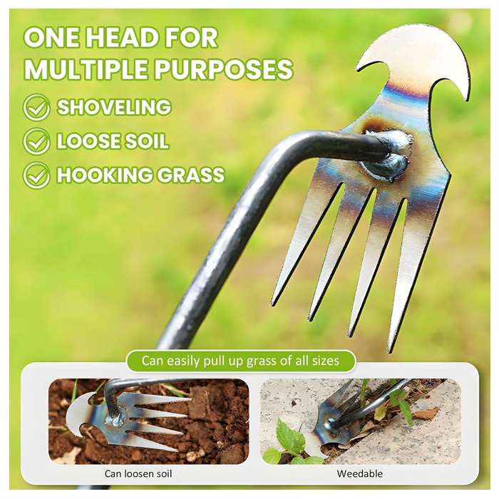 1. 高效除草 – 专为除草、挖掘和铲土设计。锋利的四齿锄头可轻松清除狭小空间内的根部,无需手动拔除杂草。