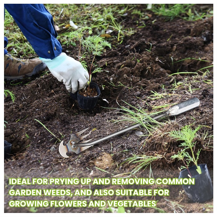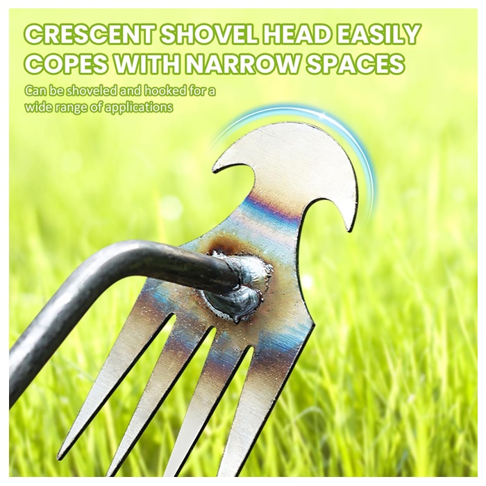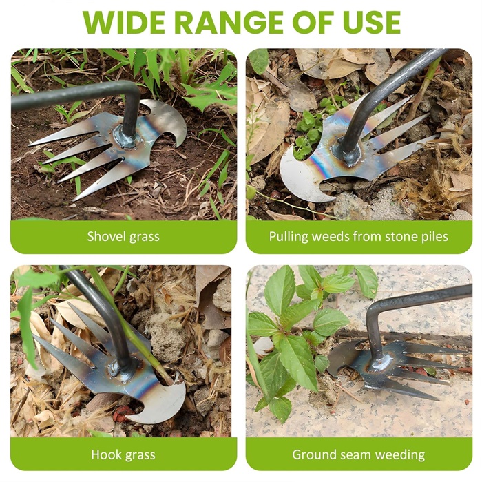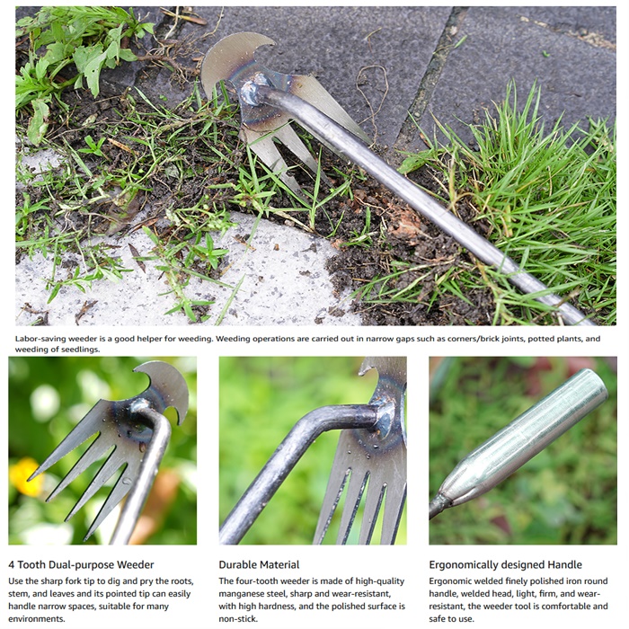 1.Penyingkiran Rumpai yang Cekap – Direka khas untuk merumput, menggali dan menyodok. Hujung 4-tin yang tajam dengan mudah menyasarkan akar dalam ruang yang sempit, menghilangkan keperluan untuk menarik rumpai dengan tangan.