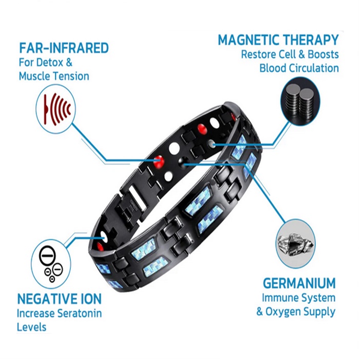 2) 男士钛钢手链:磁疗手链由坚固的医疗级钛钢制成。 钛钢是珠宝制作的绝佳材料,因为它不含铅和镍、低过敏、防水、防刮、耐腐蚀、不易氧化。