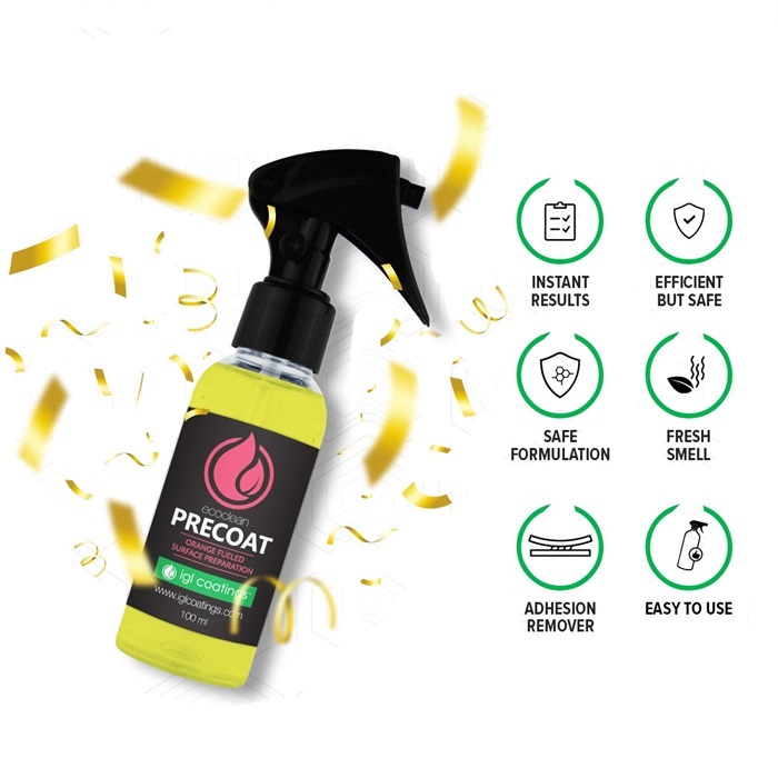Ecoclean Precoat, ialah pembersih intensif berasaskan nanoteknologi yang direka untuk melarutkan zarah minyak dan membuang sisa pengilat untuk menyediakan kerja cat untuk siri ekoat IGL Coatings. Ikatan lilin, minyak dan pengilat dilemahkan oleh precoat dan disapu dari permukaan dengan mudah. Mencipta kemungkinan untuk memperoleh kemasan ecocoat yang sempurna.