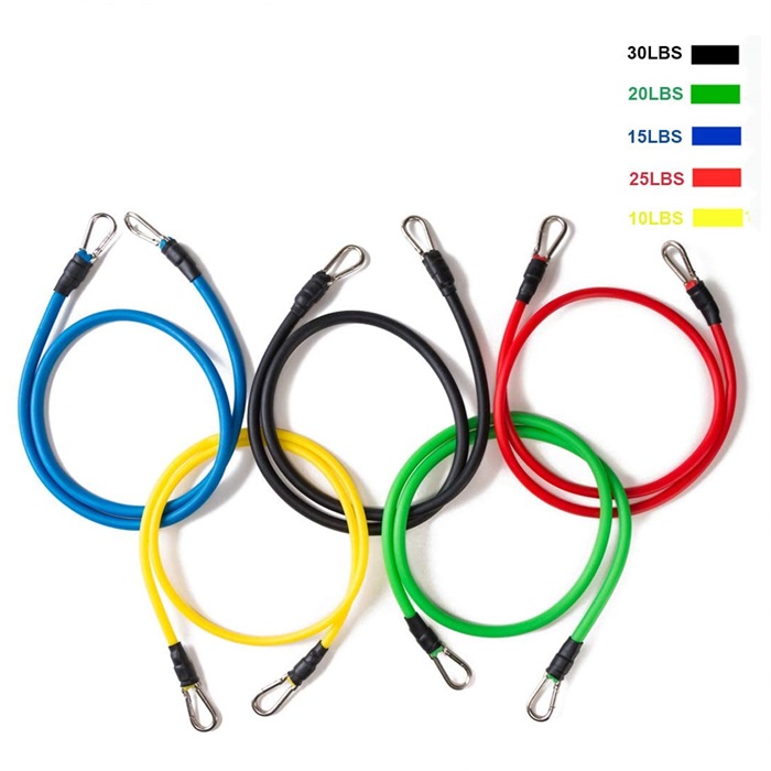 -5 RESISTANCE BANDS SET: Yellow 10 lbs, Green 15 lbs, Red 20 lbs, Blue 25 lbs, Black 30 lbs .