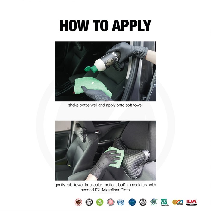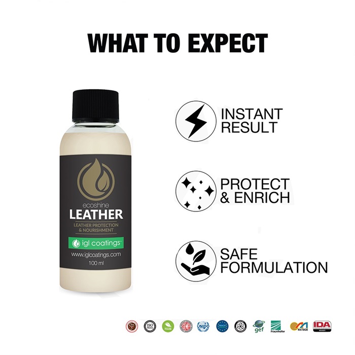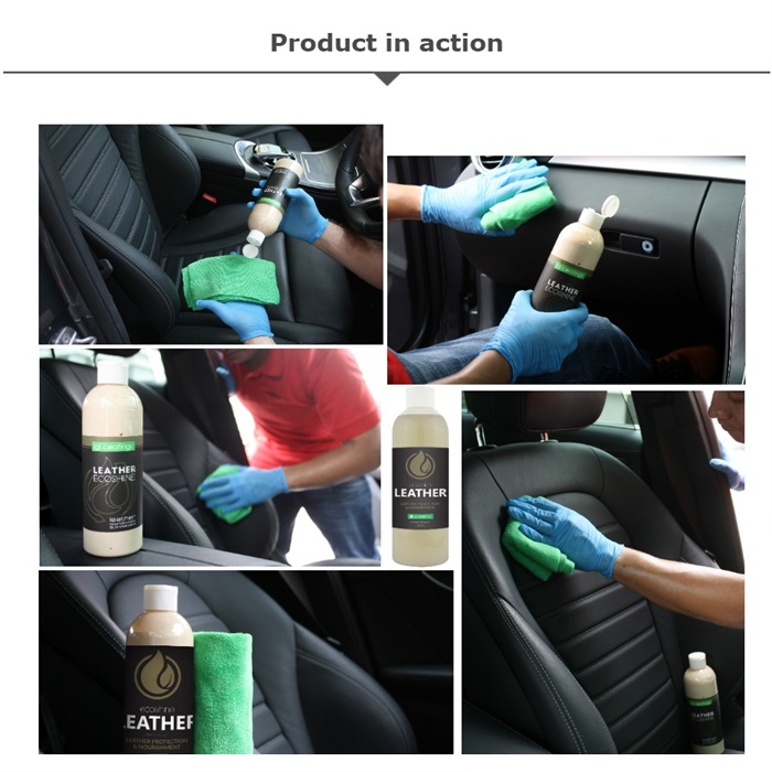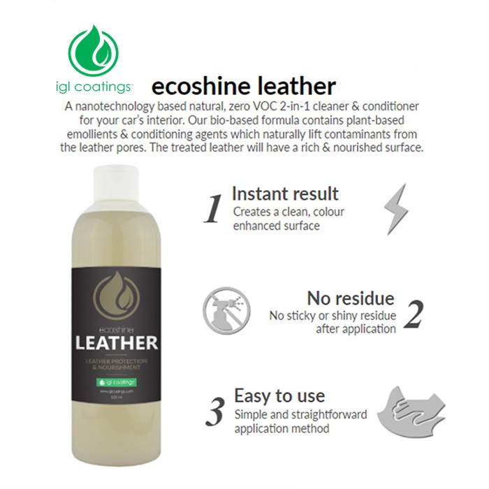 Ecoshine leather, is a nanotechnology based natural, zero VOC 2-in-1 cleaner & conditioner for your car’s interior. Our bio-based formula contains plant-based emollients & conditioning agents which naturally lift contaminants from the leather pores. The treated leather will have a rich & nourished surface.