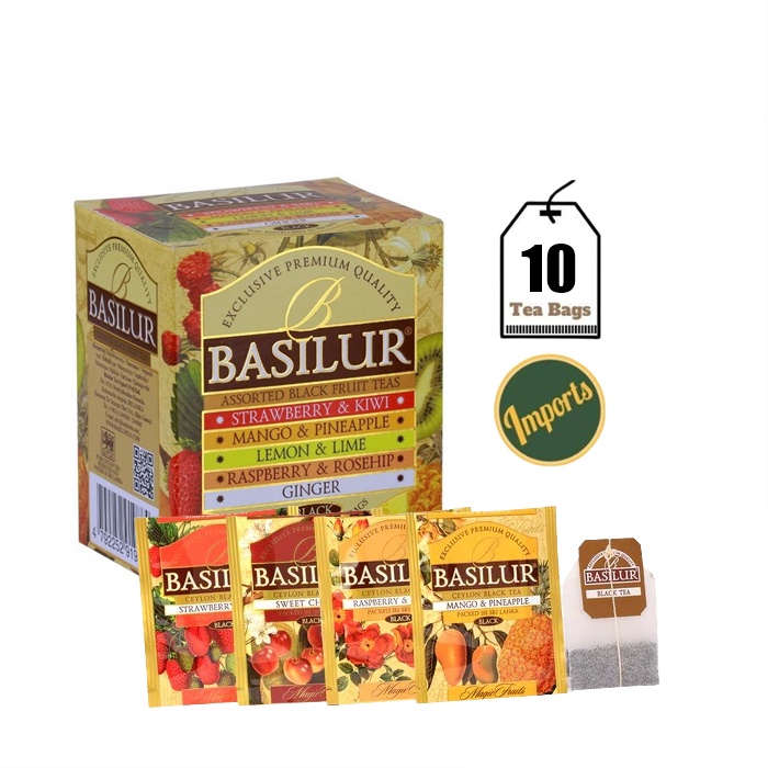 Ingredients:(Assorted) STRAWBERRY & KIWI: Ceylon black tea (94.5%) with apple (2%) and strawberry and kiwi flavor (3.5%). MANGO & PINEAPPLE: Ceylon black tea (95%) with the addition of mango (2.5%) and pineapple (2.5%) aroma. LEMON & LIME: black Ceylon tea (97%) with the addition of lemon (1.5%) and lime (1.5%) aroma. RASPBERRY & ROSEHIP: Ceylon black tea (93%) with rosehip (2%) and raspberry flavor (5%). SWEET CHERRY: Ceylon black tea (96%) with sweet cherry flavor (4%).
