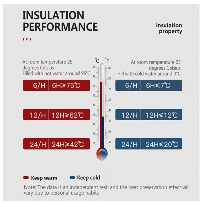 3. Diperbuat daripada keluli tahan karat 304, reka bentuk vakum lapisan dua, selamat, bebas BPA dan mesra alam, tidak berbau dan senang dibersihkan. Ia boleh menyimpan air panas atau sejuk selama 12 jam.