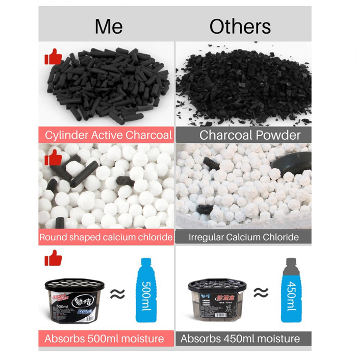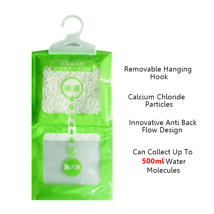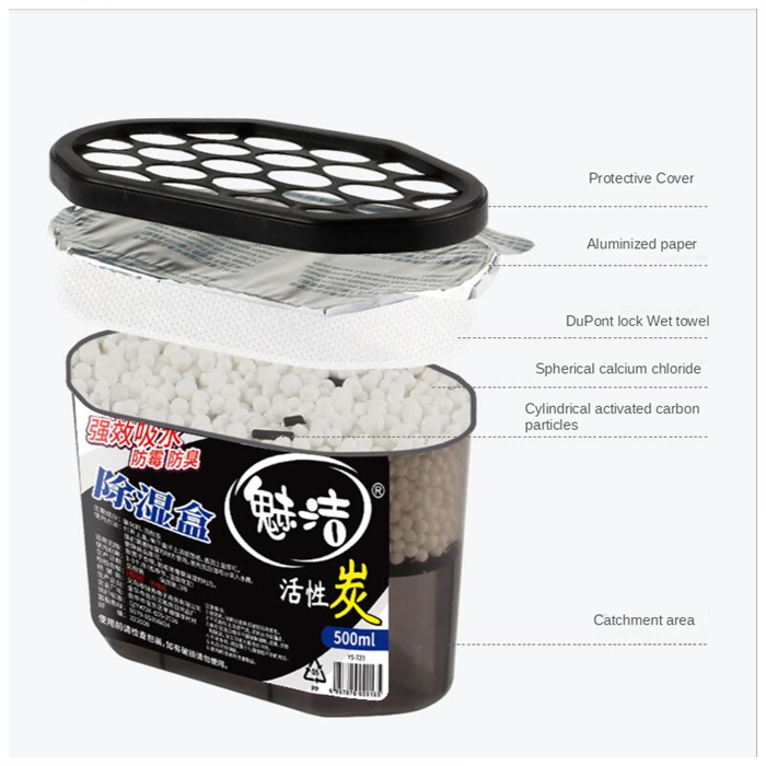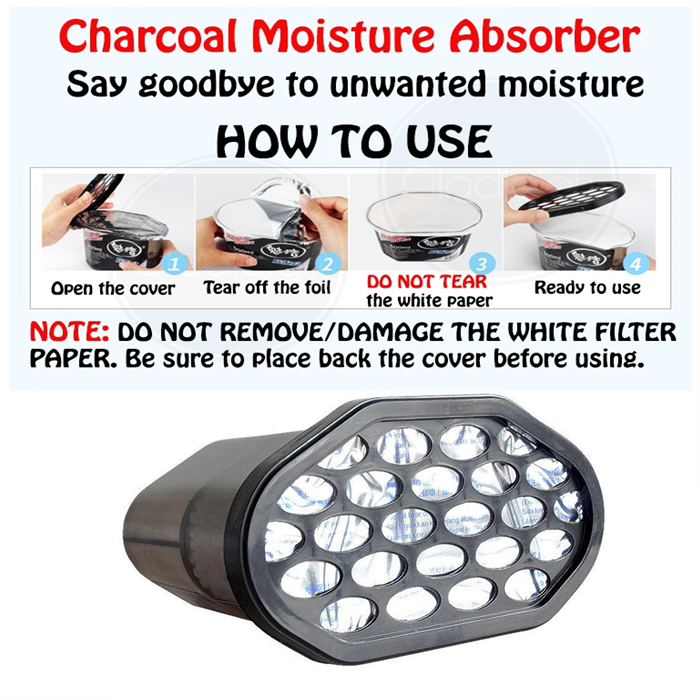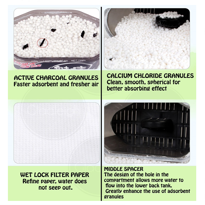 Dehumidifier dengan manik penyerap super yang kuat menyerap kelembapan berlebihan di udara untuk mengelakkan acuan, cendawan dan bau hapak. Mengandungi arang untuk meneutralkan bau.