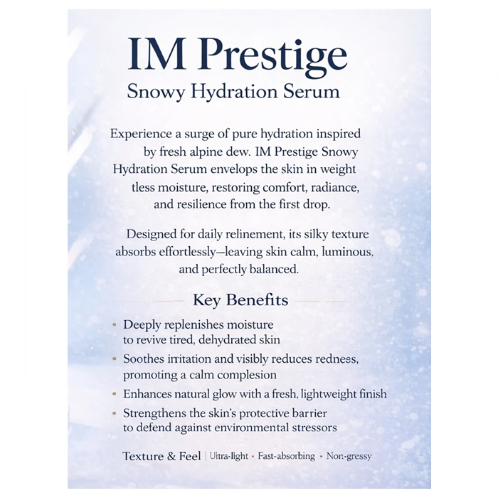 Experience a surge of long-lasting hydration inspired by fresh alpine dew. IM Prestige Snowy Hydration Serum delivers deep moisture to replenish dry, tired skin while restoring comfort, radiance, and balance from the very first application.