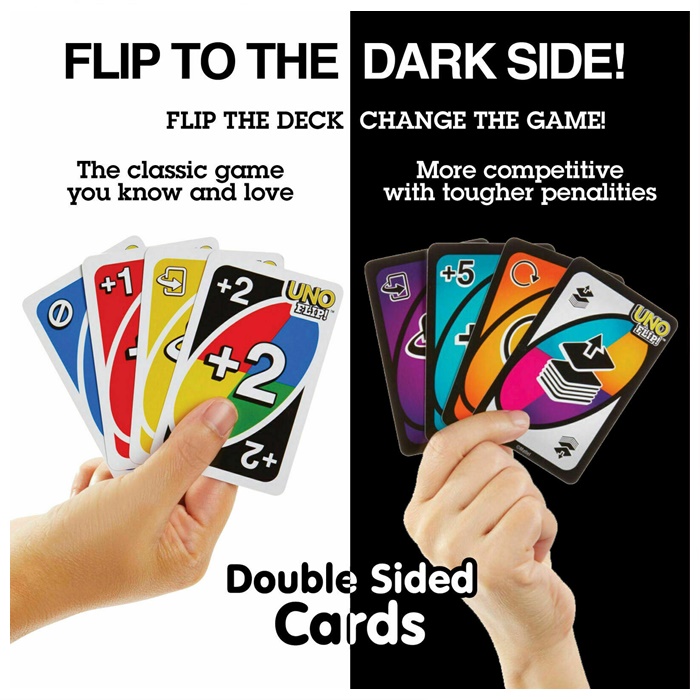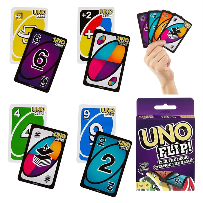 UNO FLIP! introduces fresh challenges such as Draw Five, Skip Everyone, and more, giving you endless ways to outsmart your opponents. Great for family game nights, parties, travel, gatherings, and competitive fun with friends.
