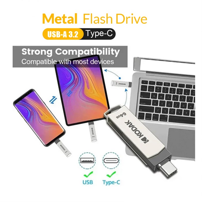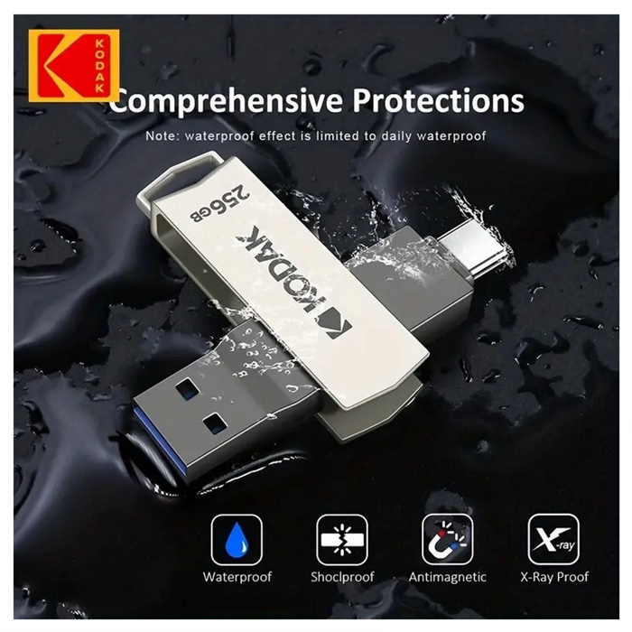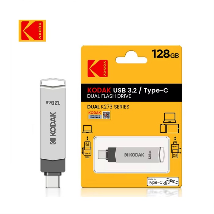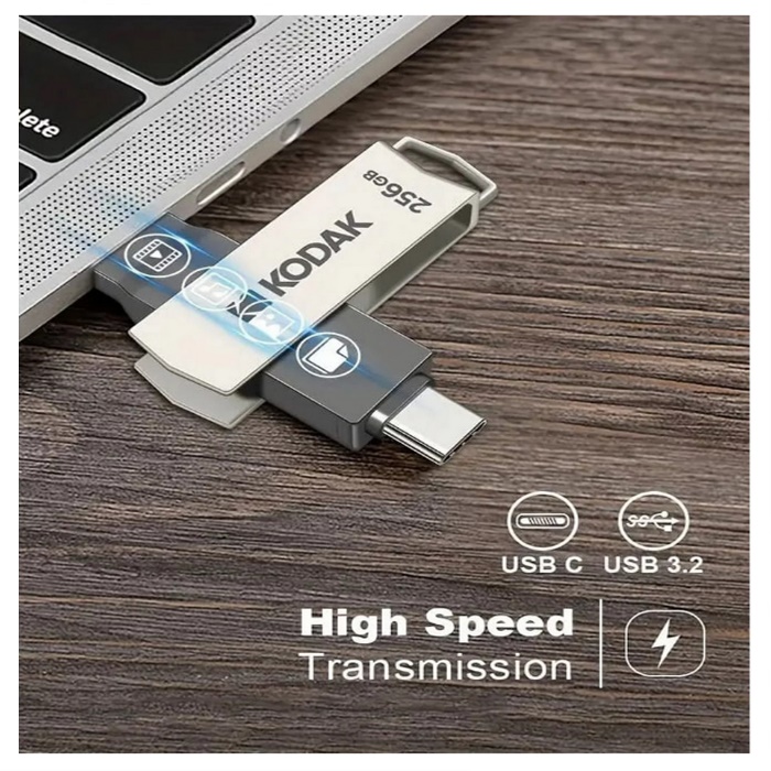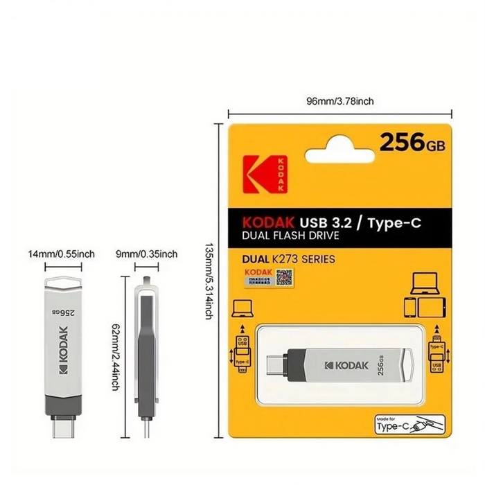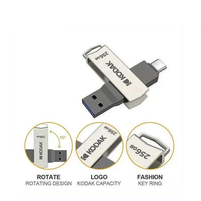 In summary, the KODAK Type-C Dual USB 3.2 Flash Drive is a blend of style, durability, and high-speed performance. Its metal construction and dual interface make it a reliable and versatile storage solution for various devices and scenarios. With its generous storage options of 128GB and 256GB, this flash drive is perfect for storing and transferring large files, photos, and videos with ease.