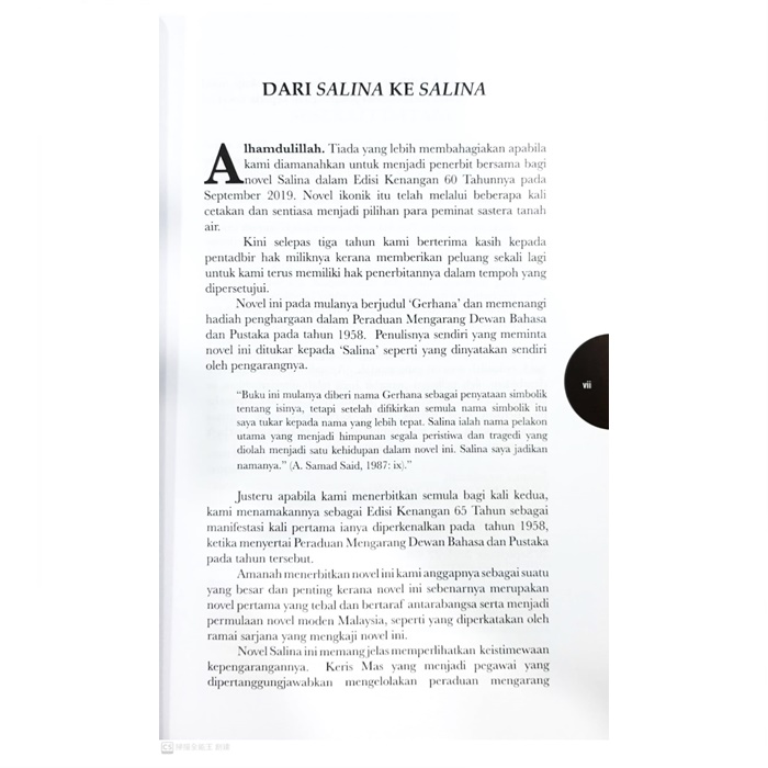 萨利纳小说,拿督萨马德说的民族文学作品,是一部巨著,永远新鲜。事实上,他的作者身份的细微差别非常接近社区,通过展示精心交织的信息和思想,并注入了很高的审美价值。正如柏拉图将历史的根源视为经验世界的源泉一样,萨马德·赛义德在萨利纳小说中将当时社会的反思带向了世界。