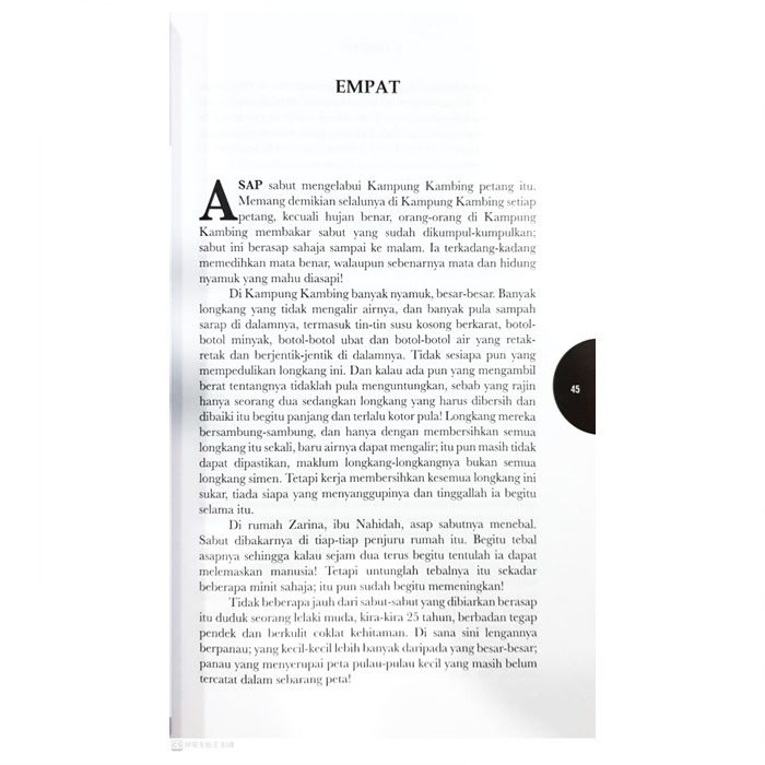 Salina takes the setting of a goat village in Singapore after the 2nd world war era. Salina highlights the narrative of the persistence of a woman who not only had to fight with the hostile post-war atmosphere, but also faced with the survival of life and the circle of poverty. reading salina is like reading a society that exists in every age even in a different setting and atmosphere.