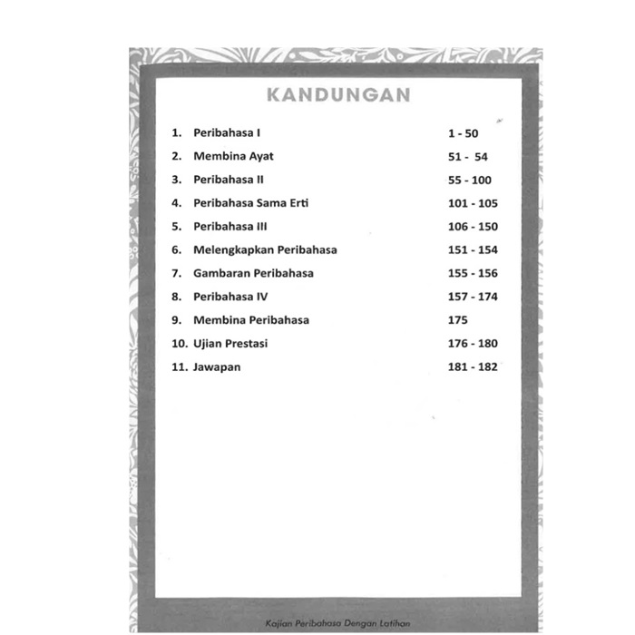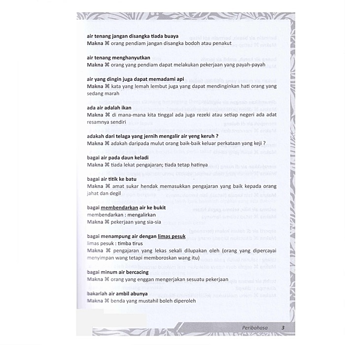 This reference and exercise book serves to strengthen the mastery of proverbs of PT3 and SPM students. Various examples of proverbs and explanations of their meanings are provided. Exercises on constructing sentences, giving meaning, completing proverbs, synonyms and constructing proverbs are provided to help high school students sit for exams with a broader knowledge of the language.