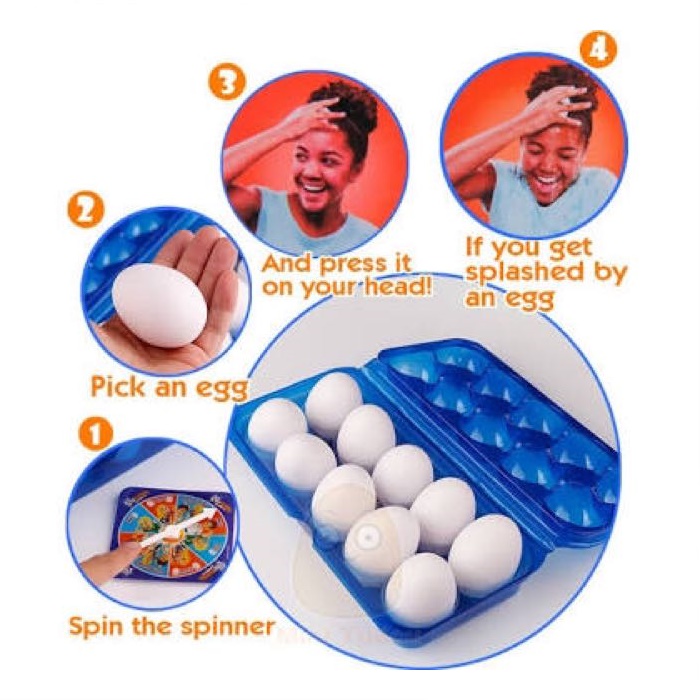 *【玩法简单】玩家需要将鸡蛋装满液体,旋转旋转器,挑选一个鸡蛋,然后将其按在头上。 如果你被鸡蛋溅到,你就出局了! 准备好迎接挑战了吗?